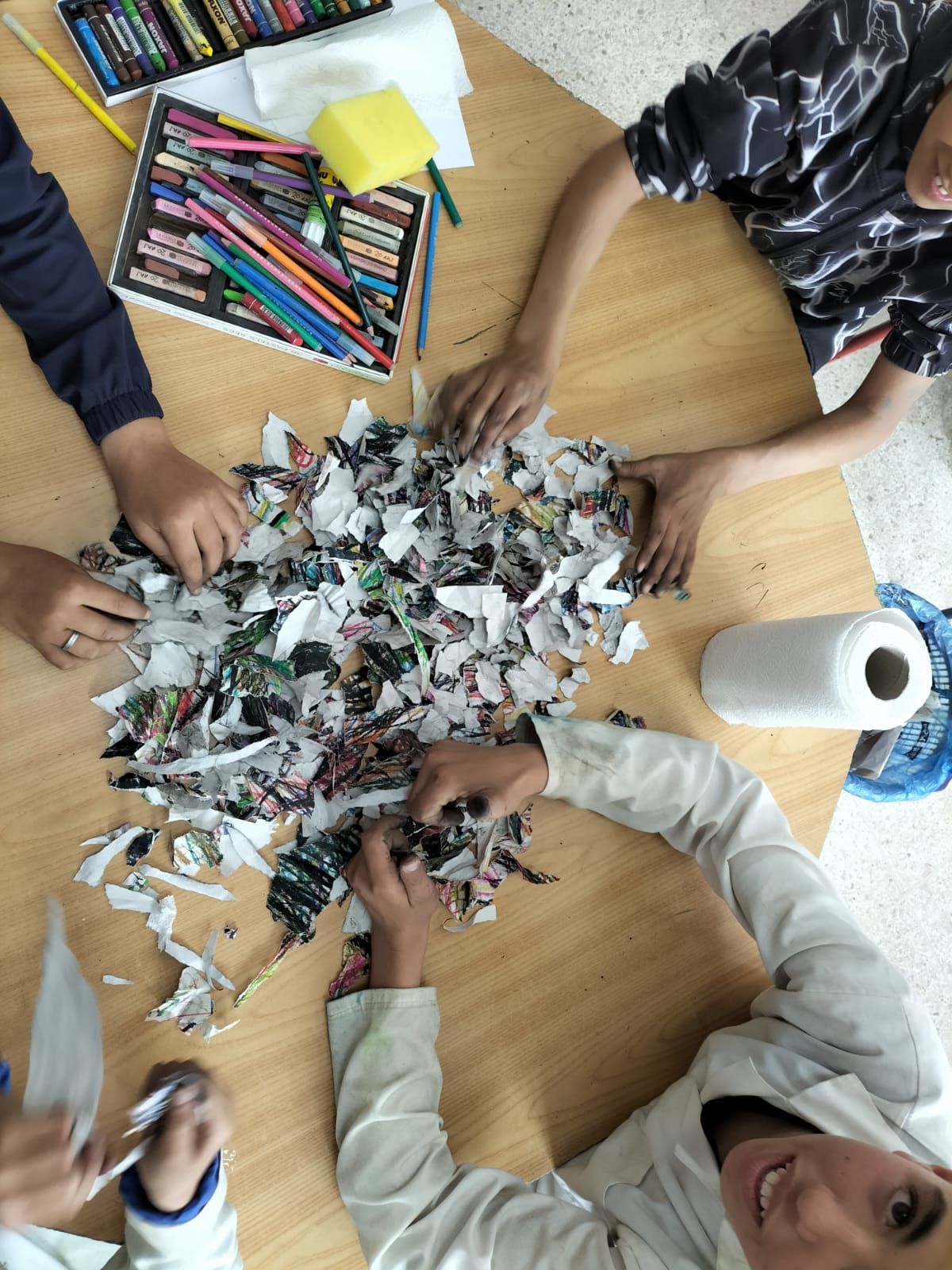 Ce moment a été particulièrement fort et a inspiré d'autres jeunes qui dessinaient dans les autres groupes et qui ont souhaité dessiner un nuage émotionnel pour le déchirer et ainsi décharger des tensions. Certains ont également voulu déchirer des dessins réalisés la veille. Là aussi, il s'agissait d'un acte symbolique d'évacuation d'émotions pesantes et de souvenirs ou de situations difficiles. Sans Rabea et Lamama, nous n'aurions jamais pu aller aussi loin. Nous leur sommes très reconnaissant.e.s et les remercions pour leur présence et pour la qualité de leurs interventions et de leurs interprétations.